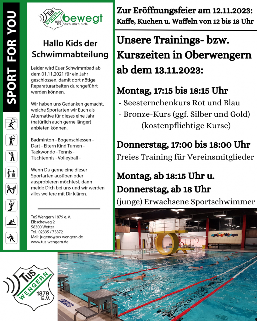 Im Oktober 2021 mussten wir euch leider mitteilen, dass das Schwimmbad in Oberwengern am 01.11.2021 für voraussichtlich ein Jahr geschlossen wird und zum Übergang auf andere Abteilungen verweisen. Das Warten hat aber nun ein Ende, denn es ist soweit und wir können euch endlich unsere neuen Kurs- und Trainingszeiten (ab Montag, 13.11.2023) im Schwimmbad Oberwengern präsentieren: