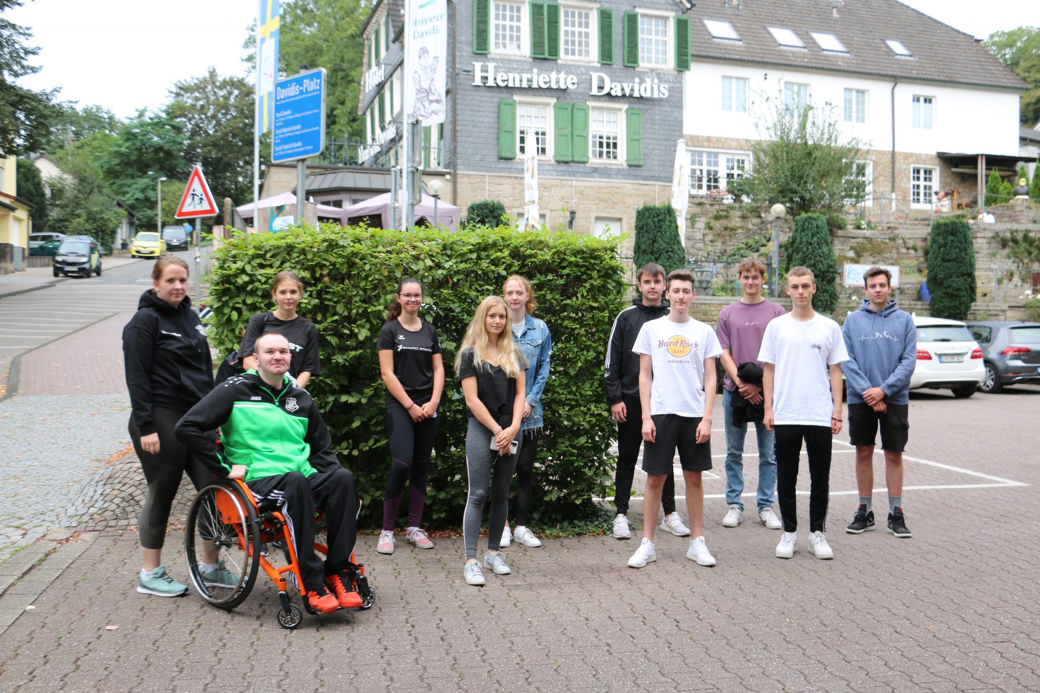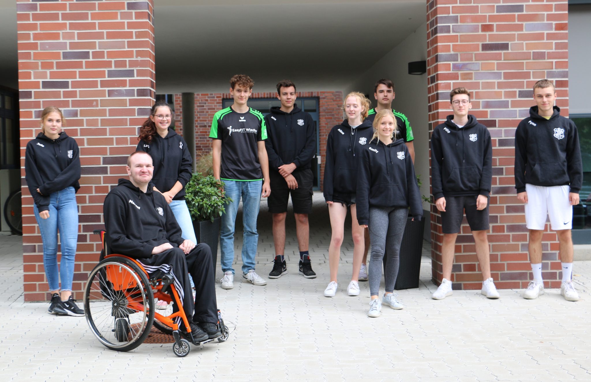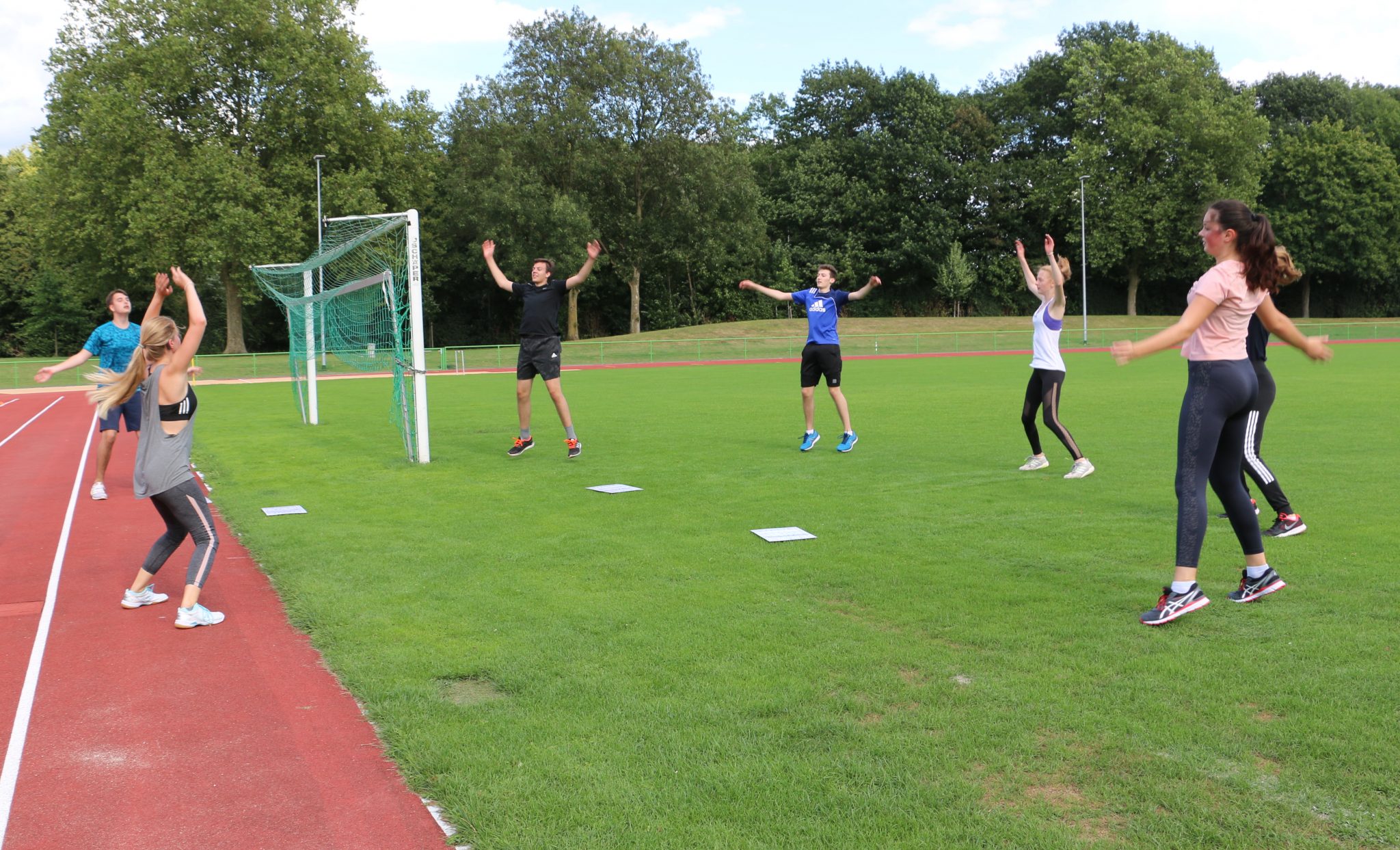 Nach einem Foto (natürlich mit ausreichend Abstand zum anderen) und der Bekanntmachung der Teamchallenge für das Wochenende, welche das Entwickeln eines Schlachtrufes ausmachte, machten wir uns, aufgeteilt in drei Autos und mit Mundschutz, auf dem Weg nach Münster zur Sporthalle. Nach ein paar Überholungen der anderen Teamautos auf der Autobahn und einmal Verfahren, kamen wir schließlich an der Halle an, wo wir uns dann auch schon direkt zum Trainieren bereit machten. Durch das intensive Training bekamen wir alle guten Hunger und brachen schließlich auch zur Jugendherberge auf, um dort (erstaunlich lecker für eine Jugendherberge) Mittag zu essen, wobei es die Tischmanieren vom ein oder anderem mit Humor zu kritisiert gab. Danach durften wir die Zimmer beziehen, Fernseher durch geheime Knöpfe anschalten um RTL zu gucken und fast einschlafen beim Ausruhen. Dann ging es aber auch schon wieder los, nämlich zu Fuß zum Sportplatz. Dort gingen wir durch Laufparcours, machten Workout-Übungen sowie Gemeinschaftsspiele wie Frisbee- Zehnerfangen, was sich als aggressiver als gedacht herausstellte (sorry Max).