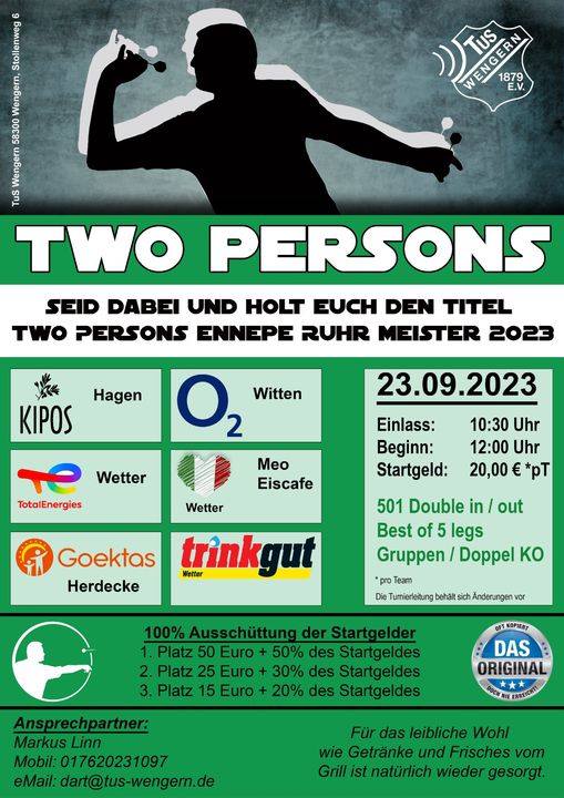 Am 23.09 fand unser Two Persons Turnier zum vierten mal statt. 26 Teams kämpften um den Titel „Ennepe-Ruhr Meister 2023″ und durchgesetzt hat sich das Team Preußen Münster mit den Spielern Paul Kohne und Enrique Sasse. Sie konnten sich im Finale gegen Team Klein & Groß, bestehend aus Jeremy Schneider und Leon Hartmann, durchsetzen. Auf Platz drei landeten Tobi Rösner und Mike Much im Team Hagen Reloaded.